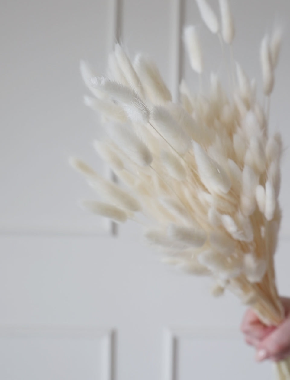El Lagurus Blanco conserva la forma esponjosa y delicada del natural, pero con un acabado más luminoso y neutro. Perfecto para dar un toque suave y elegante, tanto en composiciones minimalistas como en ramos más elaborados.