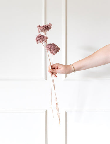 La Achillea Rosa Empolvada destaca por su tono profundo y su forma compacta, perfecta para dar un punto de color sin sobrecargar. Aporta estructura y personalidad a cualquier composición, ya sea sola en un jarrón o combinada con otras flores preservadas. Un toque diferente, con carácter y naturalidad.