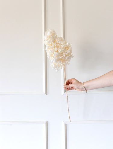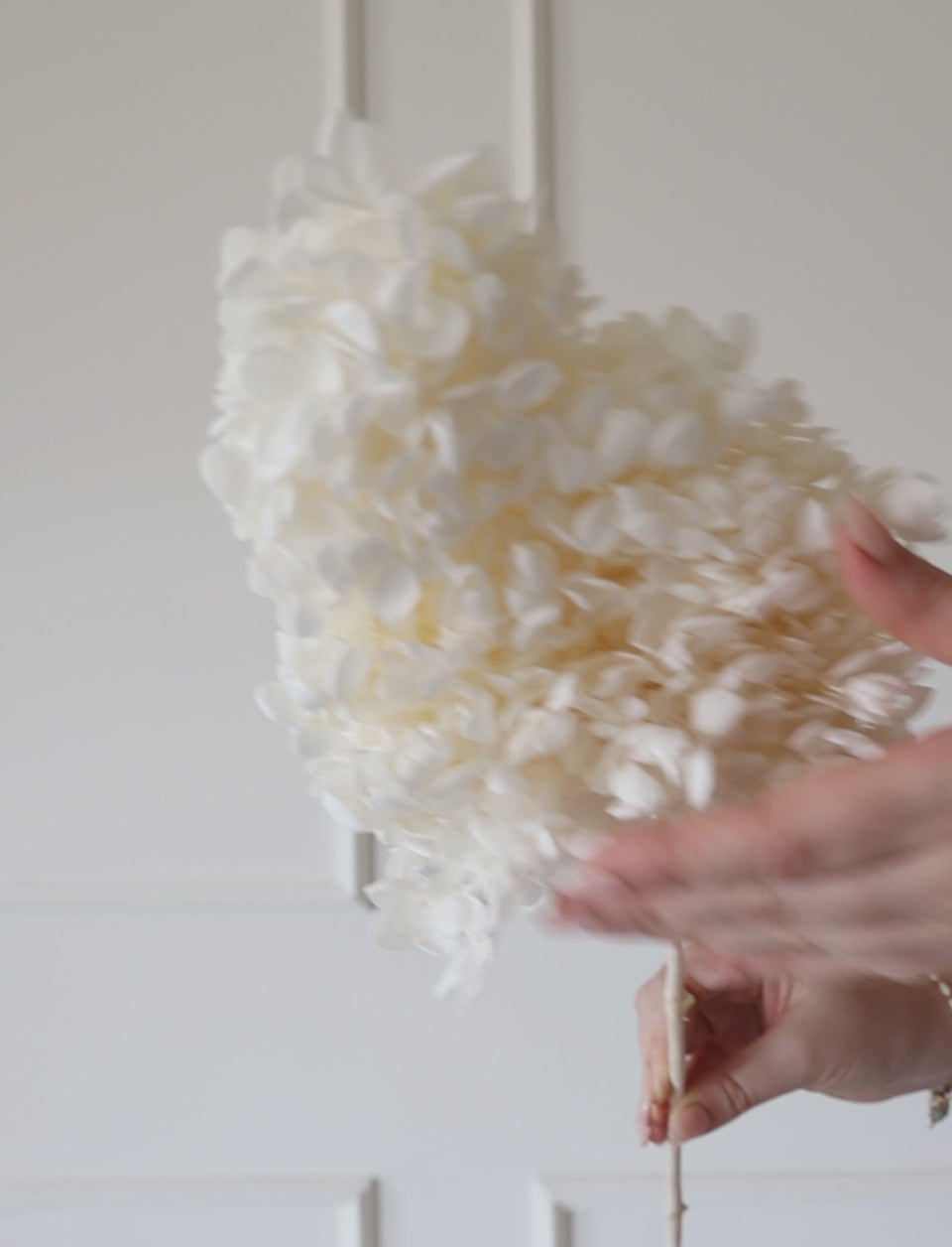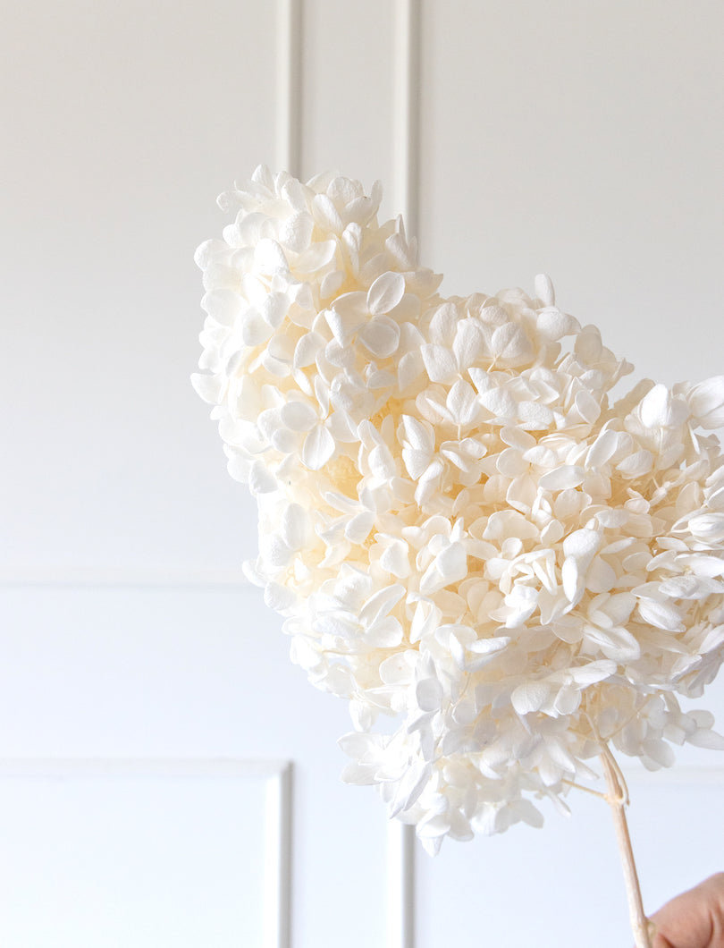 Pura, luminosa y atemporal, la Hortensia blanca es una opción versátil para cualquier tipo de decoración floral. Su volumen generoso y su tono marfil aportan elegancia y serenidad a ramos, centros de mesa o arreglos minimalistas. Ideal para bodas, espacios neutros o composiciones de estilo natural y relajado.