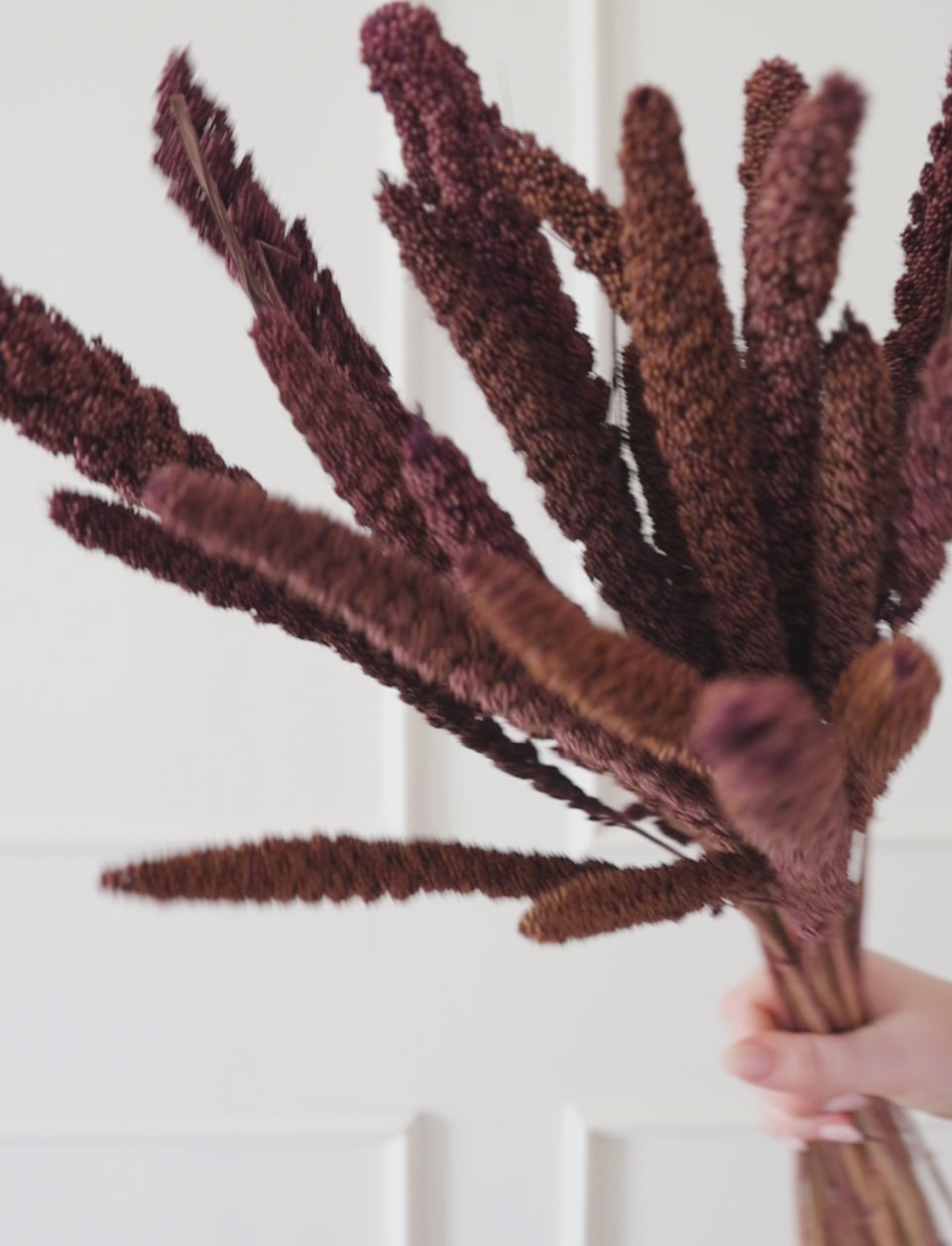 La Setaria marrón destaca por su tono cálido y terroso, ideal para composiciones otoñales o arreglos con un aire más natural y sobrio. Su forma de espiga suave aporta textura sin recargar, y combina perfectamente con flores neutras, pampas o eucalipto. Perfecta para ramos, jarrones pequeños o detalles decorativos con carácter.