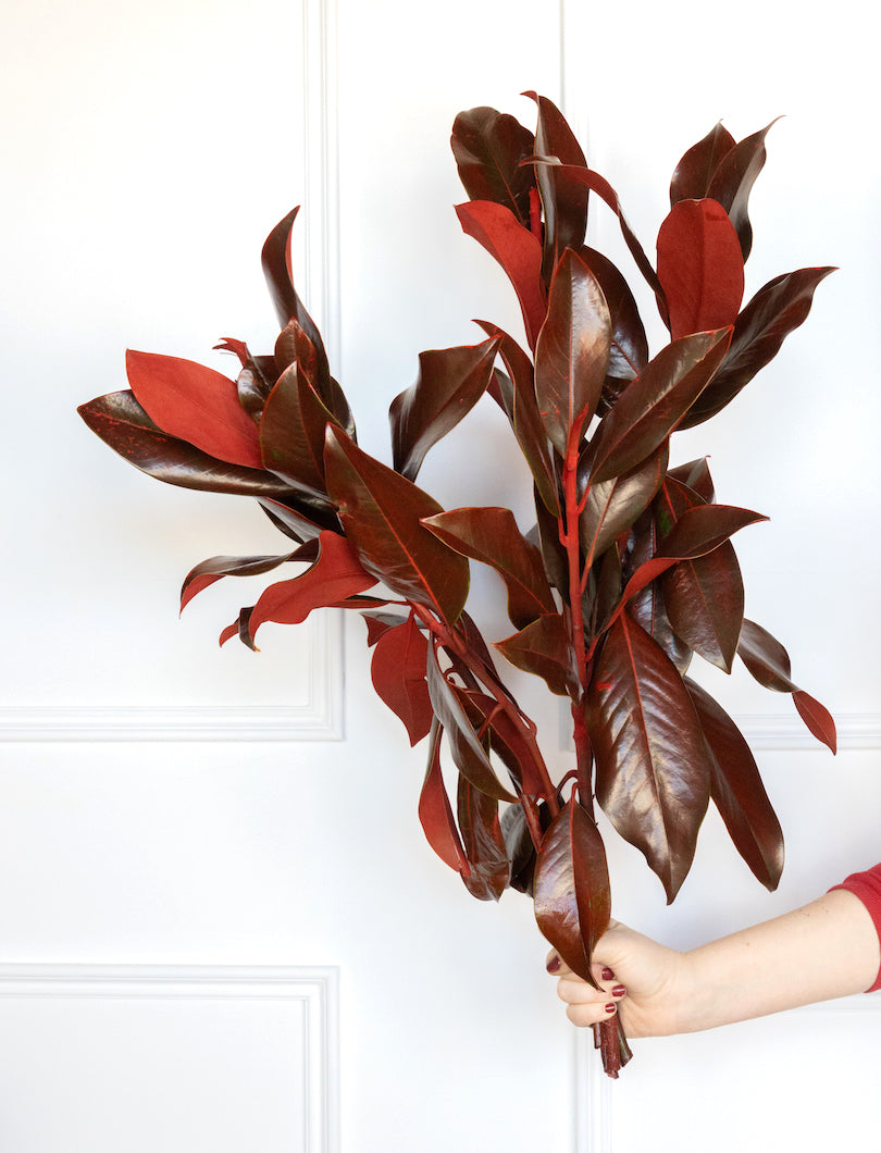 El Magnolio rojo fresco es ideal para crear decoraciones de invierno con mucha personalidad. Sus hojas grandes y consistentes, teñidas en un elegante tono rojo, aportan volumen, textura y un punto sofisticado a ramos, centros de mesa, coronas y composiciones navideñas. Combina de maravilla con abeto, eucalipto, bayas y otros elementos naturales de temporada.