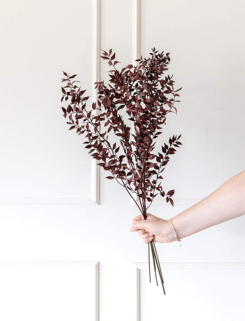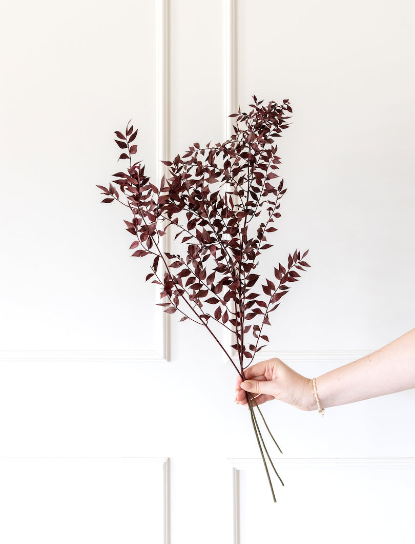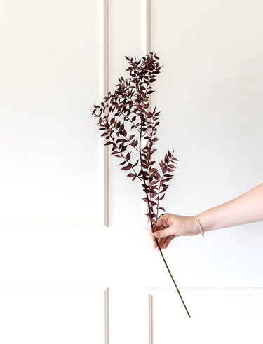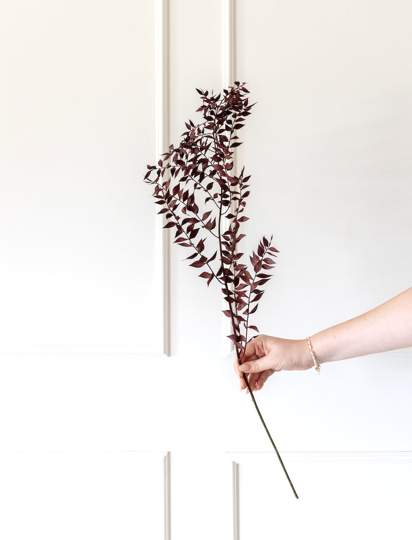 El Ruscus Burdeos tiene un tono profundo y elegante que da carácter a cualquier composición. Sus hojas alargadas aportan estructura y un punto sofisticado, ideal para contrastar con tonos más suaves o crear arreglos con mucha presencia.