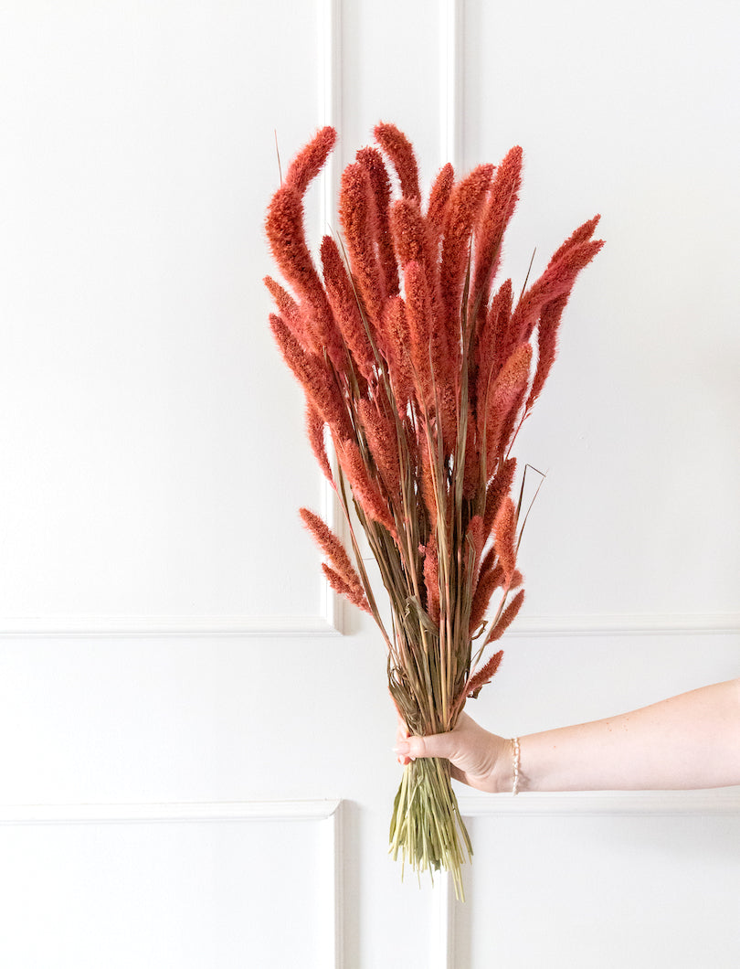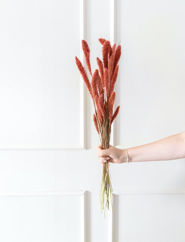 Con un tono coral suave y luminoso, esta setaria añade un toque fresco y vibrante a cualquier composición floral. Ideal para crear contraste en arreglos neutros o dar un punto de color a ramos y centros con estilo boho o primaveral. Su textura ligera y forma de espiga la hacen perfecta tanto para jarrones pequeños como para detalles decorativos con personalidad.