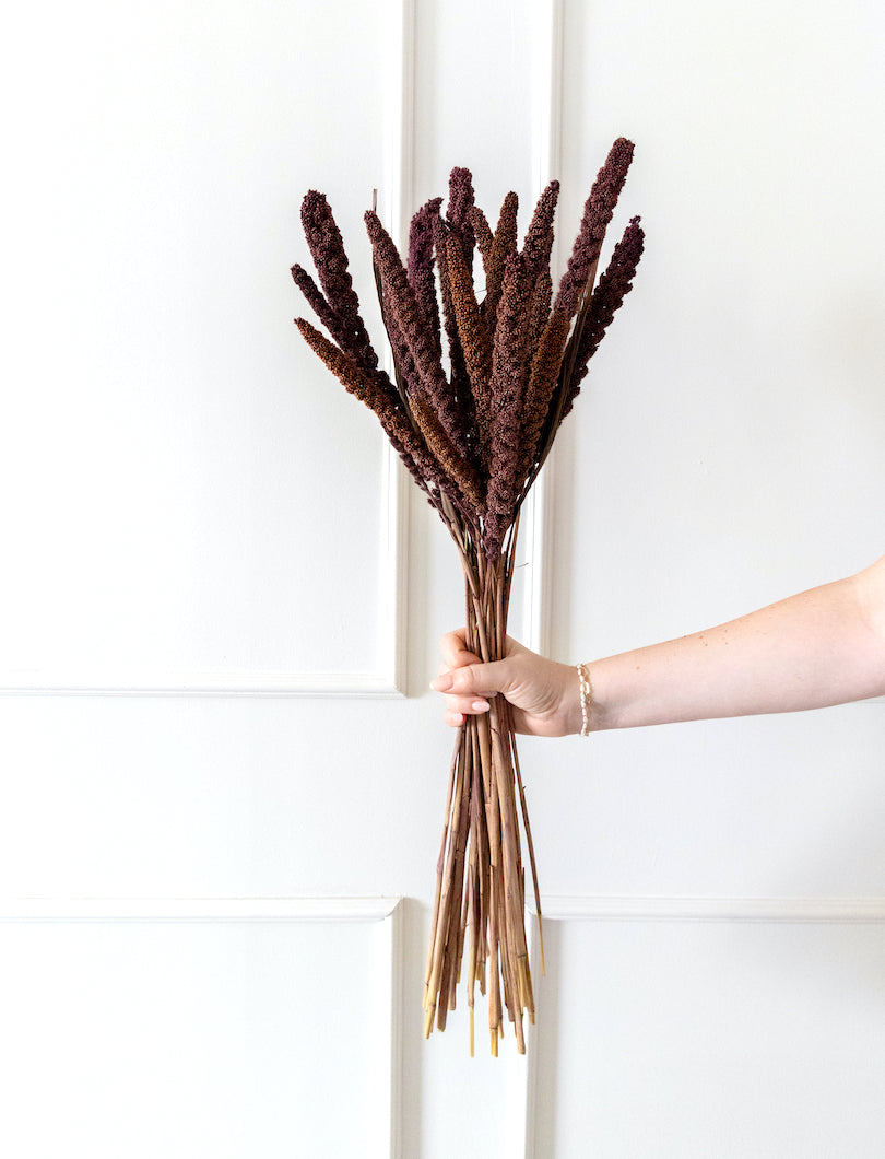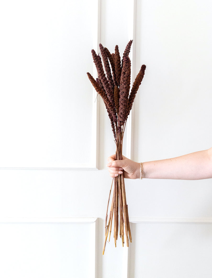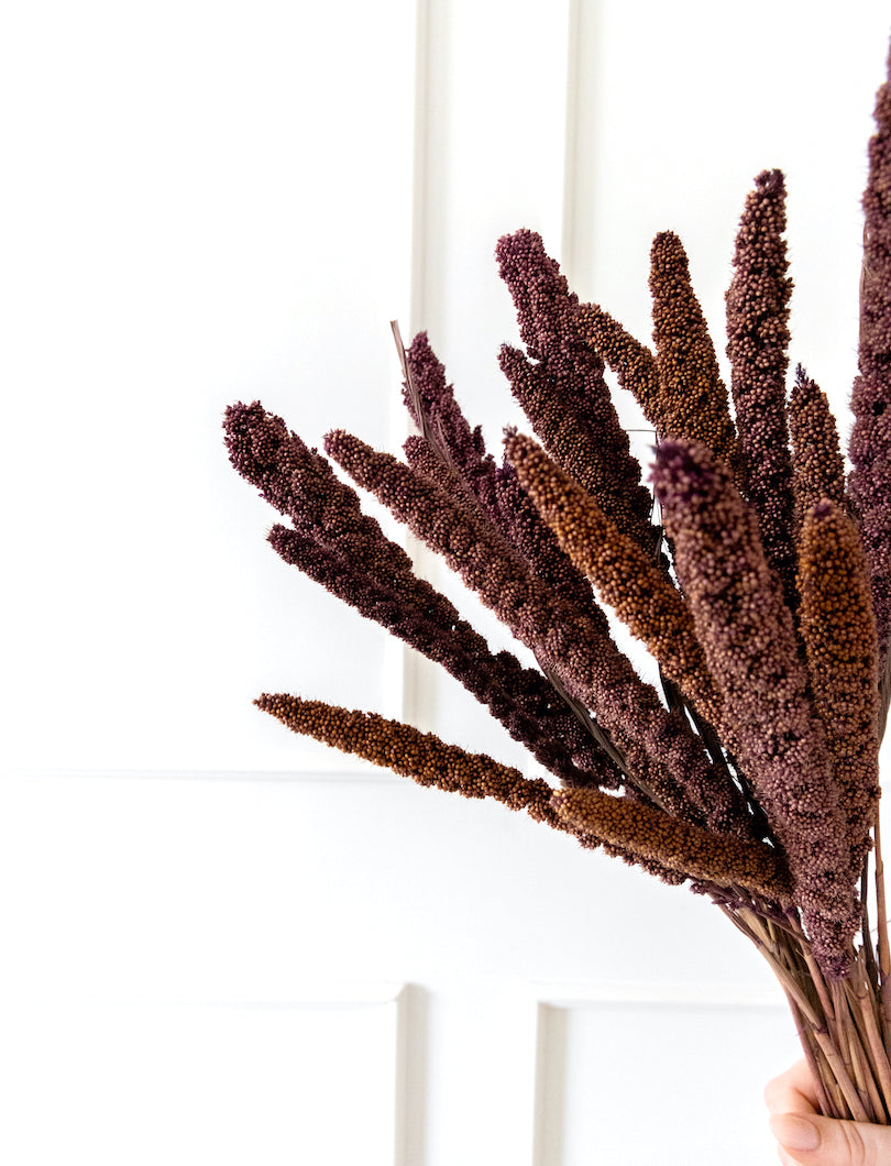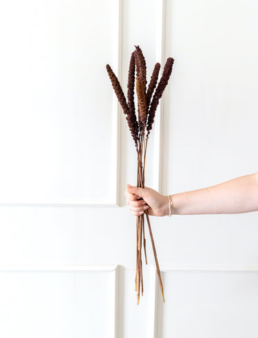 La Setaria marrón destaca por su tono cálido y terroso, ideal para composiciones otoñales o arreglos con un aire más natural y sobrio. Su forma de espiga suave aporta textura sin recargar, y combina perfectamente con flores neutras, pampas o eucalipto. Perfecta para ramos, jarrones pequeños o detalles decorativos con carácter.