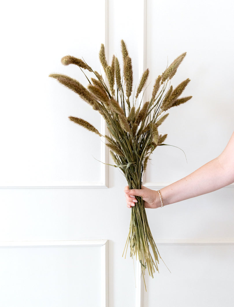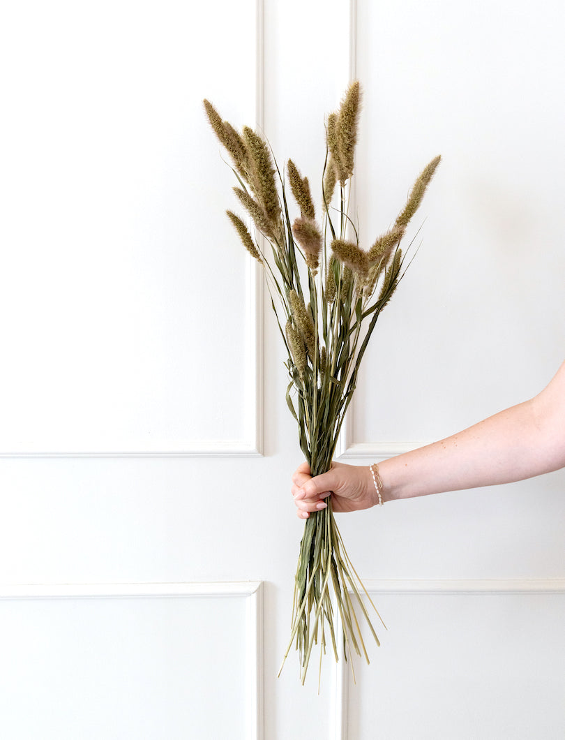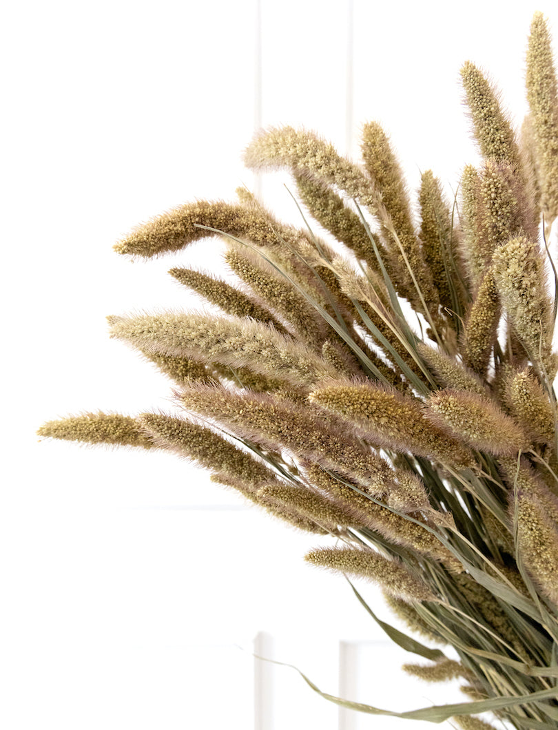 Con su forma de espiga compacta y tacto suave, la setaria en tono natural aporta textura y calidez a cualquier composición floral. Ideal para ramos boho, centros de mesa o pequeños arreglos que buscan un acabado orgánico y sin artificios. Su color neutro combina fácilmente con otros tonos y materiales.