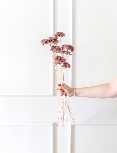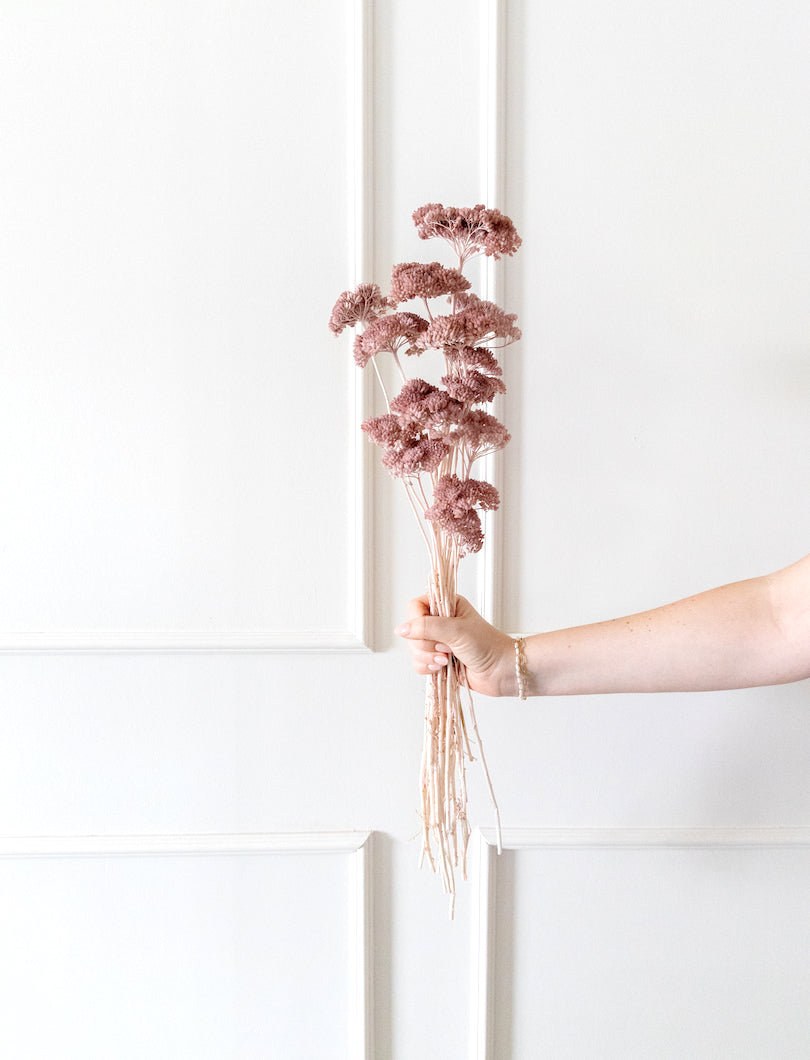 La Achillea Rosa Empolvada destaca por su tono profundo y su forma compacta, perfecta para dar un punto de color sin sobrecargar. Aporta estructura y personalidad a cualquier composición, ya sea sola en un jarrón o combinada con otras flores preservadas. Un toque diferente, con carácter y naturalidad.