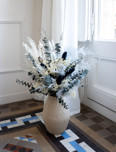 Queda ideal en jarrones medianos o grandes, en un salón neutro, un recibidor o un rincón con luz. Y como es de flores secas y preservadas, se mantiene precioso durante muchísimo tiempo, sin agua y sin mantenimiento.