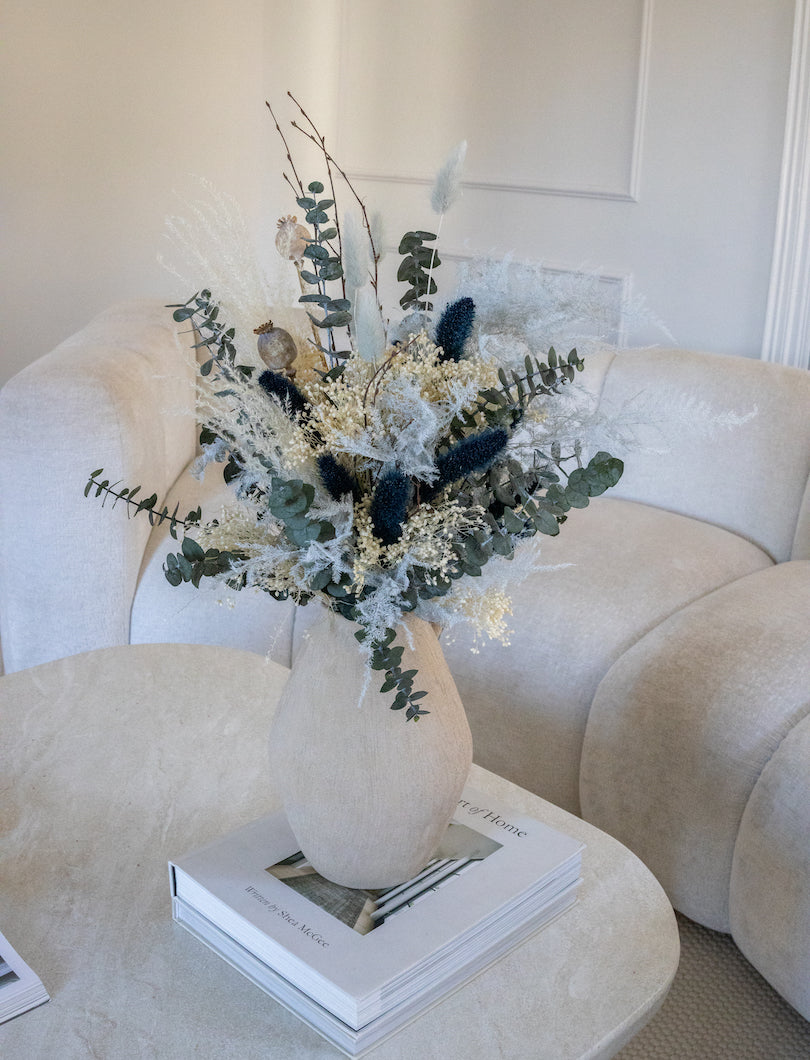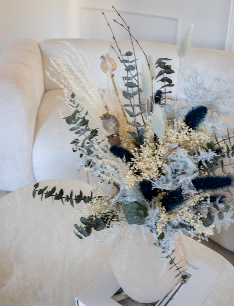 Una composición fresca y moderna, con base neutra (blancos cremosos y arena) y el contraste perfecto de acentos azul oscuro que le dan carácter sin quitarle luz. Lleva verdes que aportan estructura y un montón de texturas ligeras para que el ramo se vea natural y con movimiento, nada rígido.