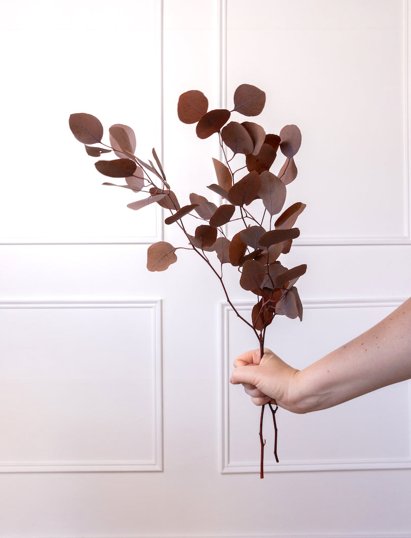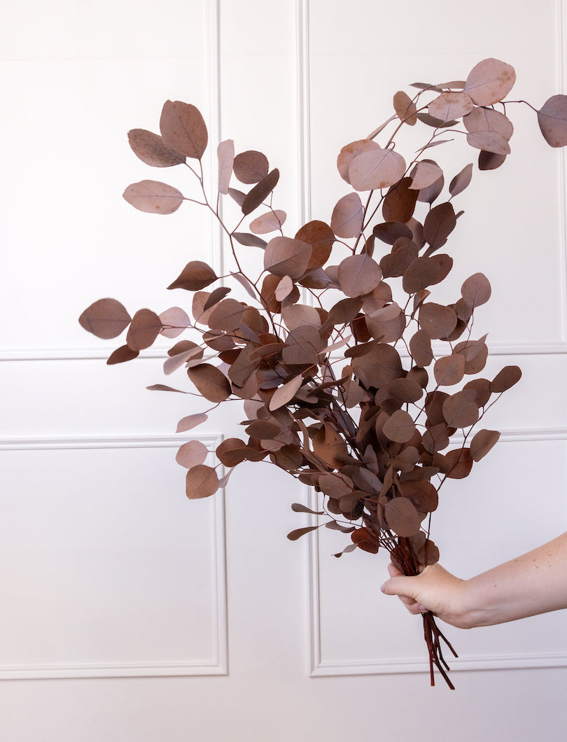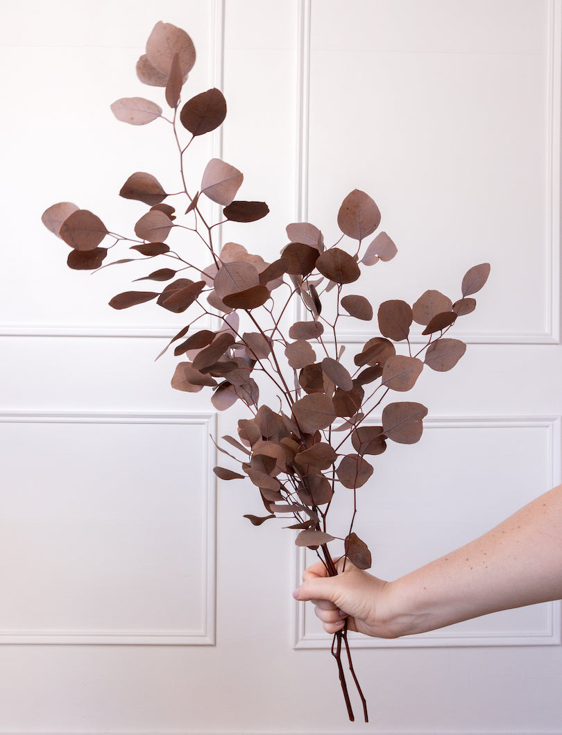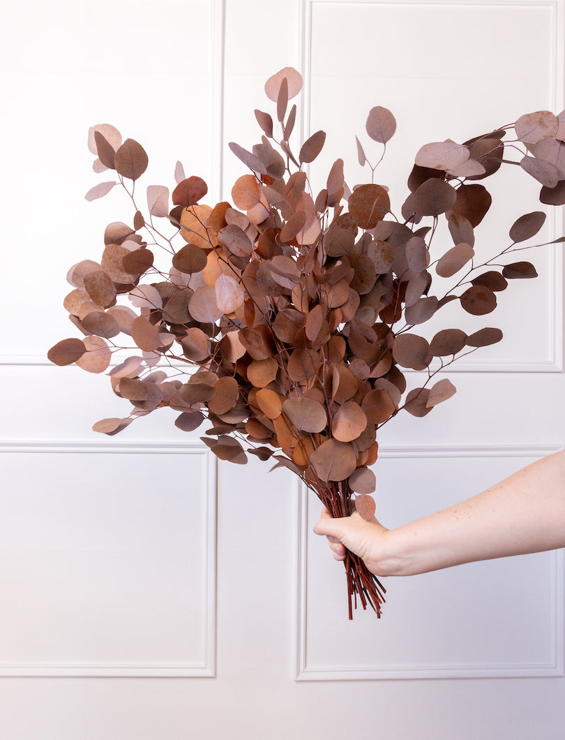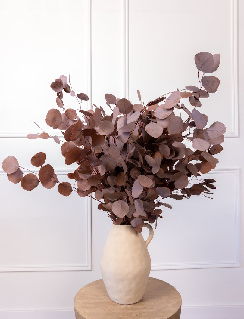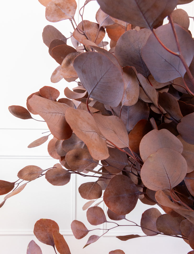 El eucalipto Populus es ese “verde” que lo arregla todo… pero en versión marrón cálido (muy otoñal, muy elegante). Sus hojas redondas aportan volumen y estructura al instante y, al ser preservado, mantiene su forma y su color durante muchísimo tiempo.